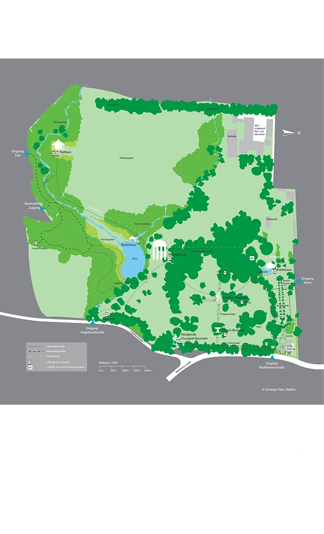 Heute ist dieser Traum für jedermann zugänglich und entführt in ein Gartenparadies von verwunschener Schönheit. Auf verschlungenen Wegen trifft der Spaziergänger auf alte Skulpturen und Brunnen, ein Monopteros steht erhaben und das Entenhaus erinnert an die ländliche Idylle. Dichte Gehölzgruppen, lichte Haine und offene Gartenräume sind zu begehen. Zu allen Jahreszeiten beeindruckt der Park mit seiner malerische Kulisse.
