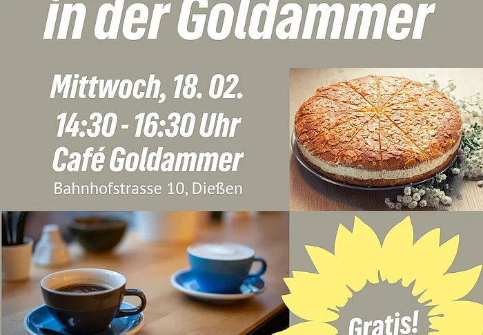 Die Grünen Dießen laden herzlich zu einem gemütlichen Nachmittag ein! Am Mittwoch, den 18. Februar, öffnen wir die Türen im Café Goldammer für unser Senioren-Café. Genießen Sie bei Kaffee und Kuchen (natürlich gratis!) nette Gespräche in entspannter Atmosphäre. Dies ist die ideale Gelegenheit, um mit unseren Kandidatinnen und Kandidaten für den Gemeinderat sowie unserem Bürgermeisterkandidaten Kieran Smolka persönlich ins Gespräch zu kommen. Kommen Sie einfach vorbei – wir freuen uns auf den Austausch mit Ihnen und auf einen schönen gemeinsamen Nachmittag!
