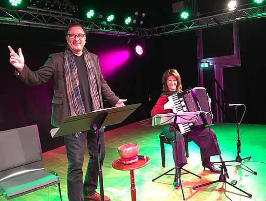 Portrait: Maria Reiter stammt aus Oberbayern und entdeckte mit fünf Jahren das Akkordeon und das Lesen. Beides erwies sich als folgenschwer. Neben zahlreichen CD- Aufnahmen und Uraufführungen in diversen Kammermusikformationen mit Freude an sprechender Musik, zieht es sie zu musikalischer Sprache. Sie teilt sich die Bühne mit u.a. immer wieder gerne mit Stefan Wilkening, Elisabeth Kulman, Michaela May, Norbert Nagel, Gerald Huber, Christian Gruber, Friedrich von Thun, Rudi Spring, Senta Berger und vielen anderen. Der Schauspieler und Sprecher Stefan Wilkening ist neben seinen Theaterengagements (u.a.: Münchner Kammerspiele, Schauspiel Frankfurt, Bayerisches Staatsschauspiel) in zahlreichen Dokumentationen, Hörfunk- und Hörbuchproduktionen zu hören, sowie in verschiedenen Film- und Fernsehproduktionen zu sehen.