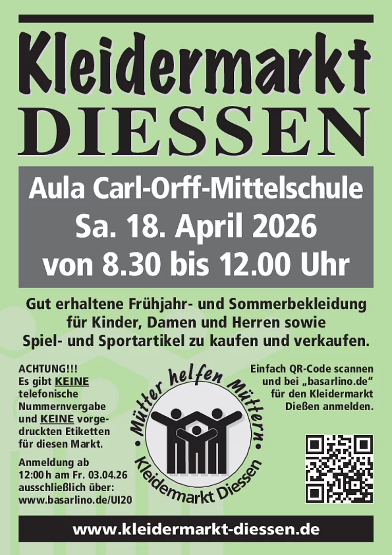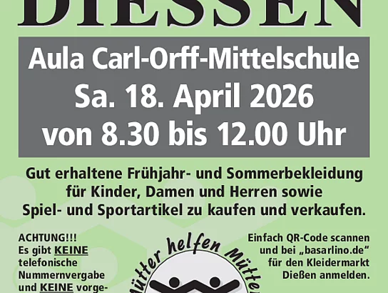 Unter dem Motto: „Mütter helfen Müttern“ findet am Samstag, den 18. April 2026 von 8:30 Uhr bis 12:00 Uhr, der Dießener Kleidermarkt in der Aula der Carl Orff Mittelschule statt.