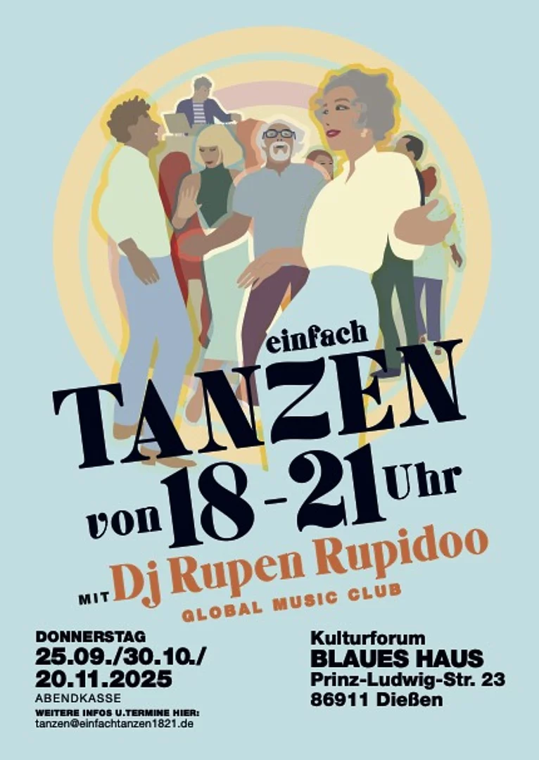 An diesem Abend verwandelt sich das Kulturforum Blaues Haus in Dießen von einem Ausstellungsraum in eine Tanzfläche. Das neue Format „einfach tanzen“ lädt von 18 bis 21 Uhr zu einem besonderen After-Work-Tanzerlebnis ein. Auf vielfachen Wunsch wird die Veranstaltung im Blauen Haus mit DJ Rupen von Rupidoo Global Music Club ausgerichtet, der für seine legendären Jalla Club Abende in Münchner Völkerkundemuseum bekannt ist.