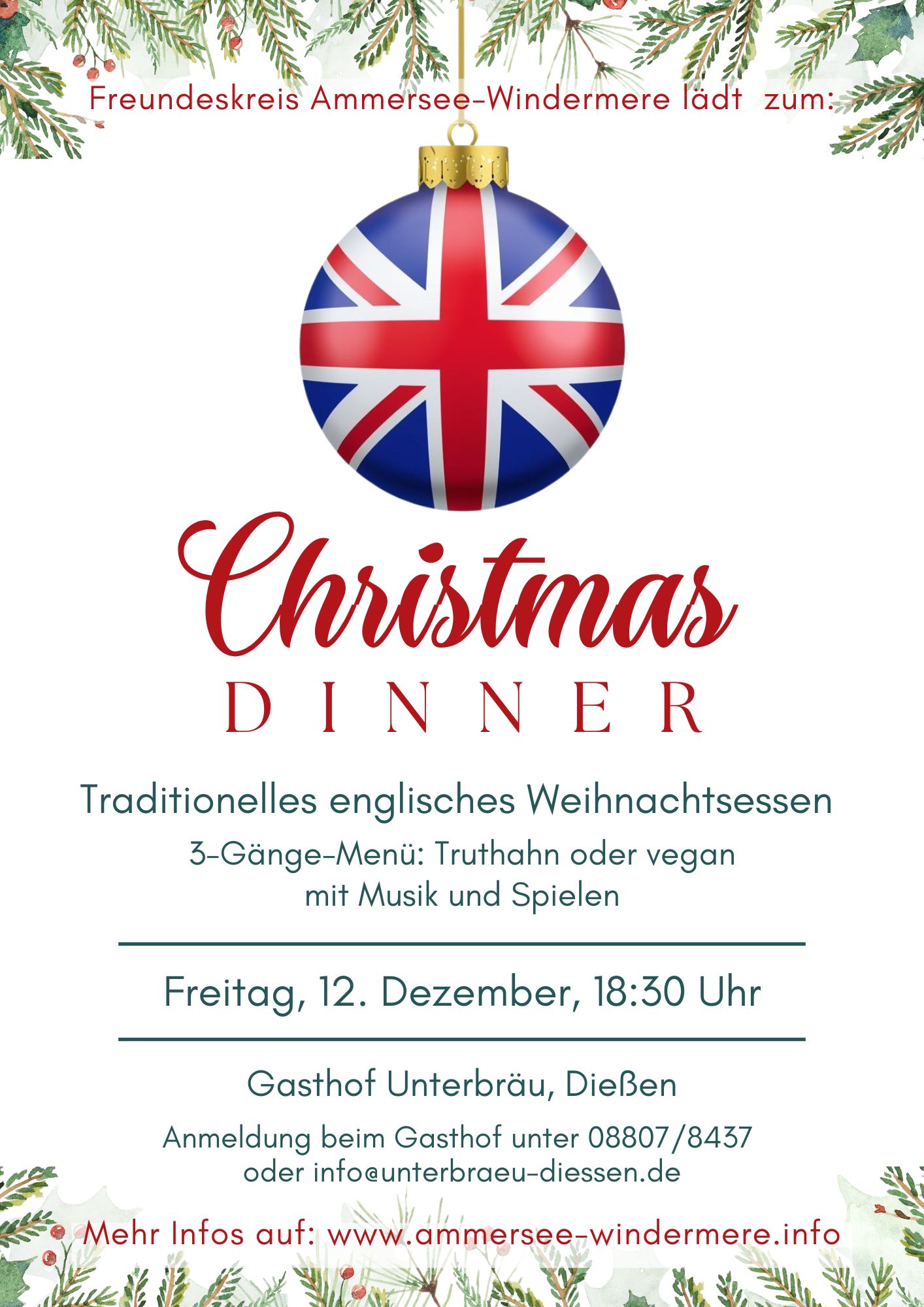 Der Freundeskreis Ammersee-Windermere lädt herzlich zu seinem traditionellen English Christmas Dinner ein.