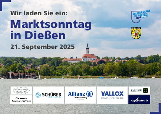 Der Gewerbeverband Dießen lädt zum verkaufsoffenen Marktsonntag ein. Offene Geschäfte im Ort NEUE und altbewährte Markt-Aussteller Die örtliche Gastronomie und die Bewirtungsstände laden ein mit süßen und herzhaften Spezialitäten - auch vegetarisch..