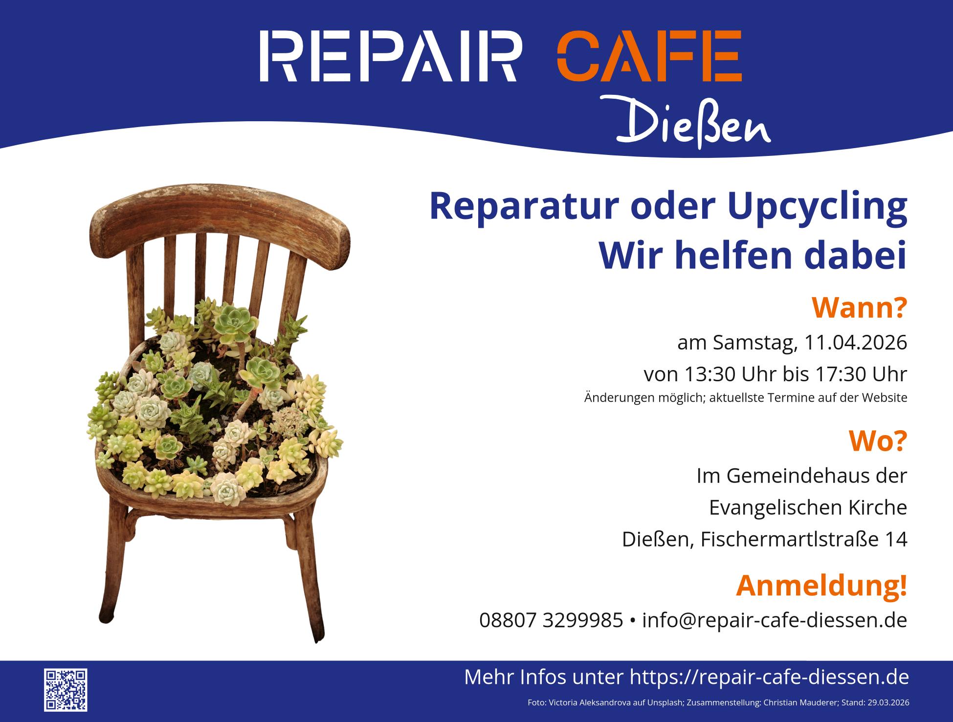 Wir laden Sie herzlich zu unserer nächsten Reparaturveranstaltung ein. Der Ort ist das Gemeindehaus Dießen der Evangelischen Kirche, gelegen in der Fischermartlstraße 14 (Jocherplatz).