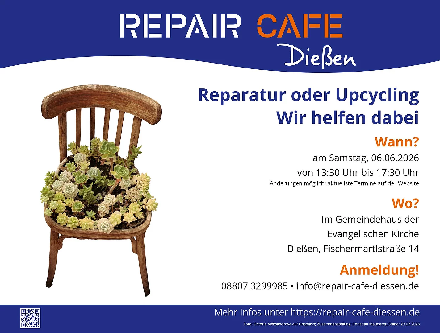 Wir laden Sie herzlich zu unserer nächsten Reparaturveranstaltung ein. Der Ort ist das Gemeindehaus Dießen der Evangelischen Kirche, gelegen in der Fischermartlstraße 14 (Jocherplatz).