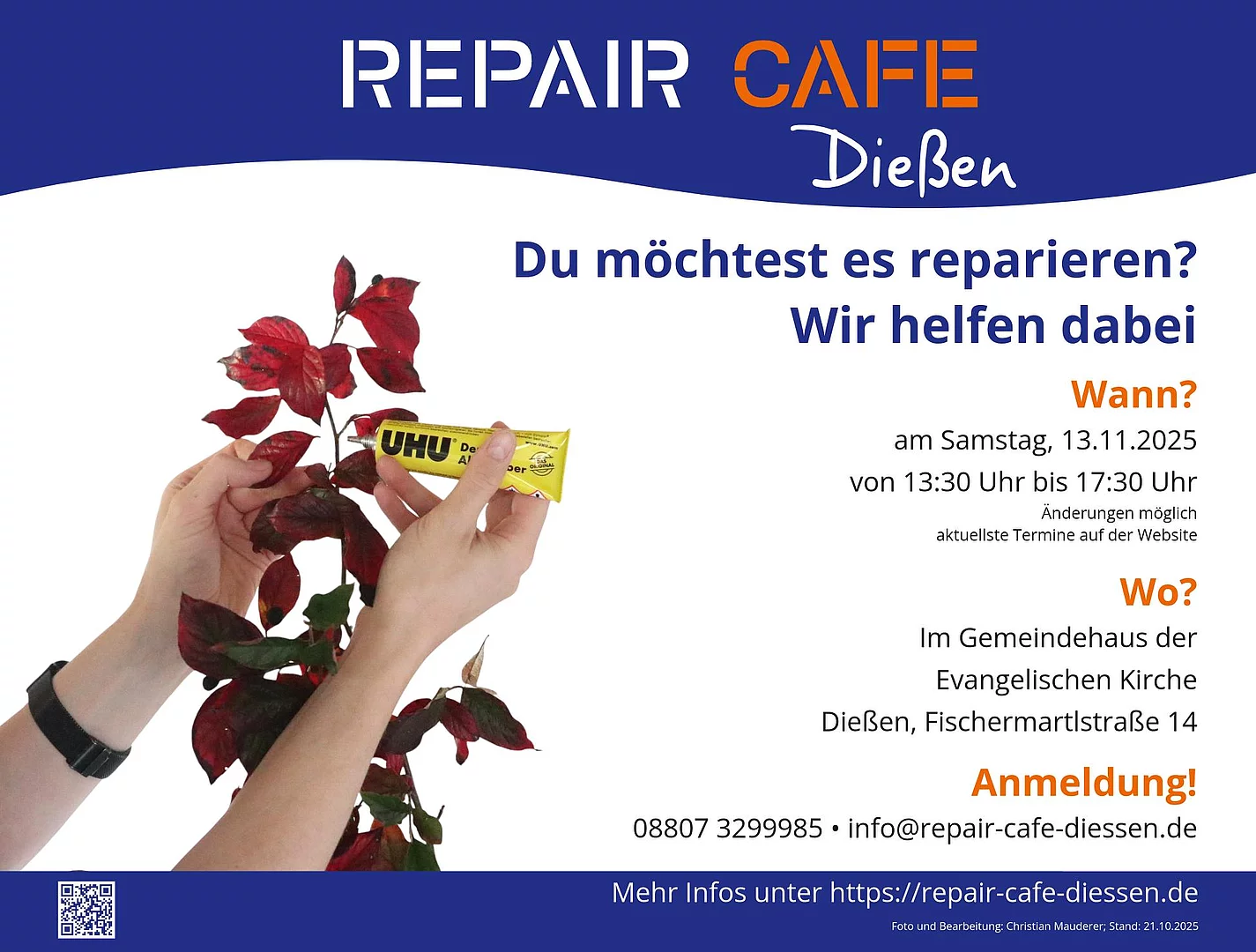 Wir laden Sie herzlich zu unserer nächsten Reparaturveranstaltung ein. Der Ort ist das Gemeindehaus Dießen der Evangelischen Kirche, gelegen in der Fischermartlstraße 14 (Jocherplatz).