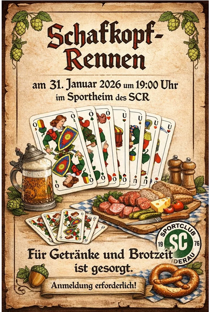 Der SC Riederau lädt herzlich ein zum Schafkopf-Rennen am 31. Januar 2026 um 19:00 Uhr im Sportheim des SCR.