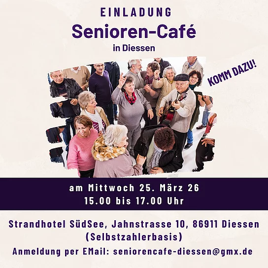 Und weiter geht es mit dem Angebot für ältere Bürger in Dießen. Das nächste Seniorencafé findet am Mittwoch, 25.3.2026 im Strandhotel SüdSee statt. Für leckere Kuchen ist gesorgt! Anmeldung bitte per E-Mail an seniorencafe-diessen@gmx.de