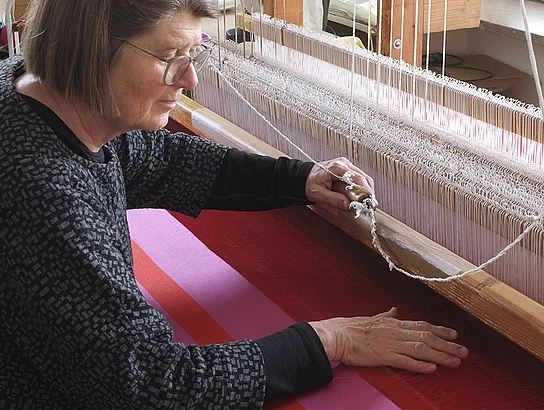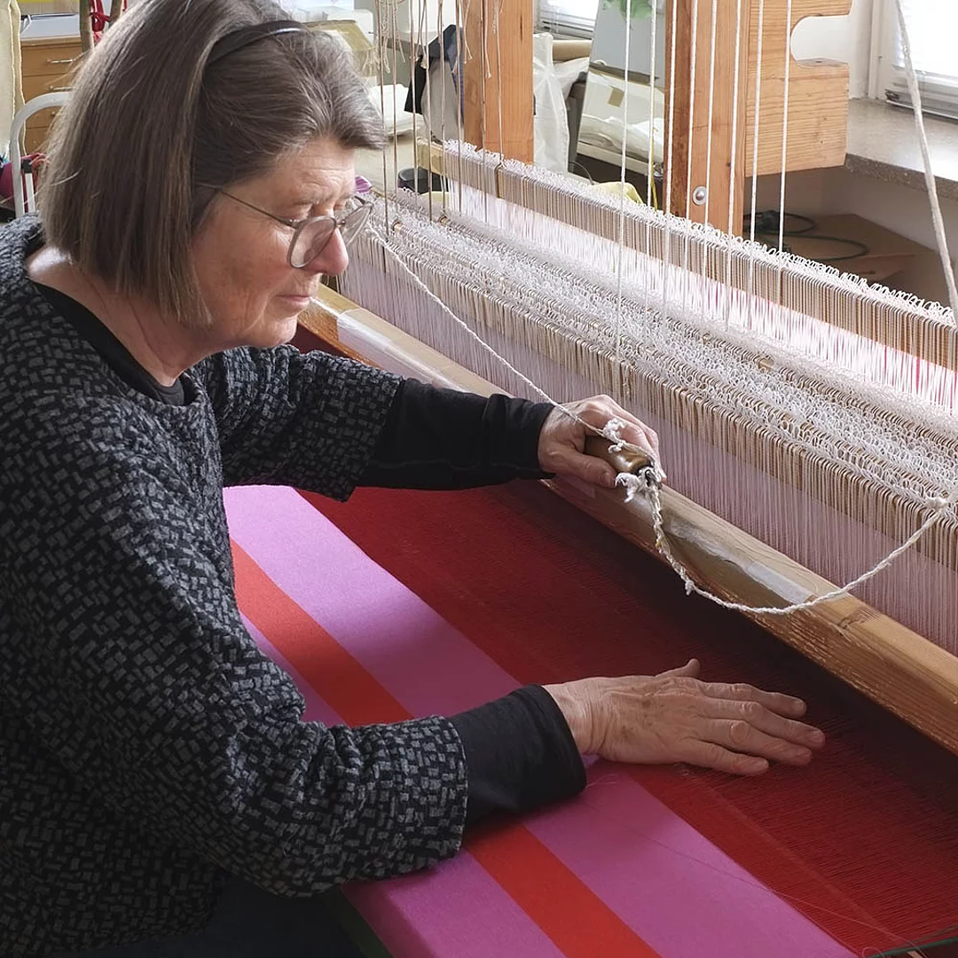 Maja Vogl schloss eine Handweberlehre ab und studierte anschließend Malerei. Mit fein ausgesponnener Seide in kräftigen Tönen entstehen Schals und Stolen, Farbflächen zum Tragen. Während die Seidenstoffe klar konstruiert werden, lässt Maja Vogl bei ihren Papierschals den gelenkten Zufall mitspielen.