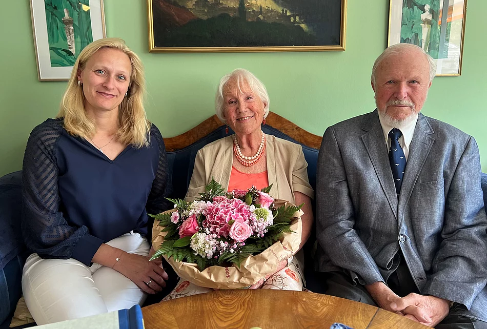 Es ist selten, dass Bürgermeisterin Sandra Perzul zu solch einem besonderen Jubiläum gratulieren kann. Entsprechend groß war die Freude auch bei den Jubilaren Uta und Reinhard Ziegler, die die Bürgermeisterin zu einem persönlichen Termin in ihrer Wohnung in der Seniorenresidenz Augustinum begrüßten.