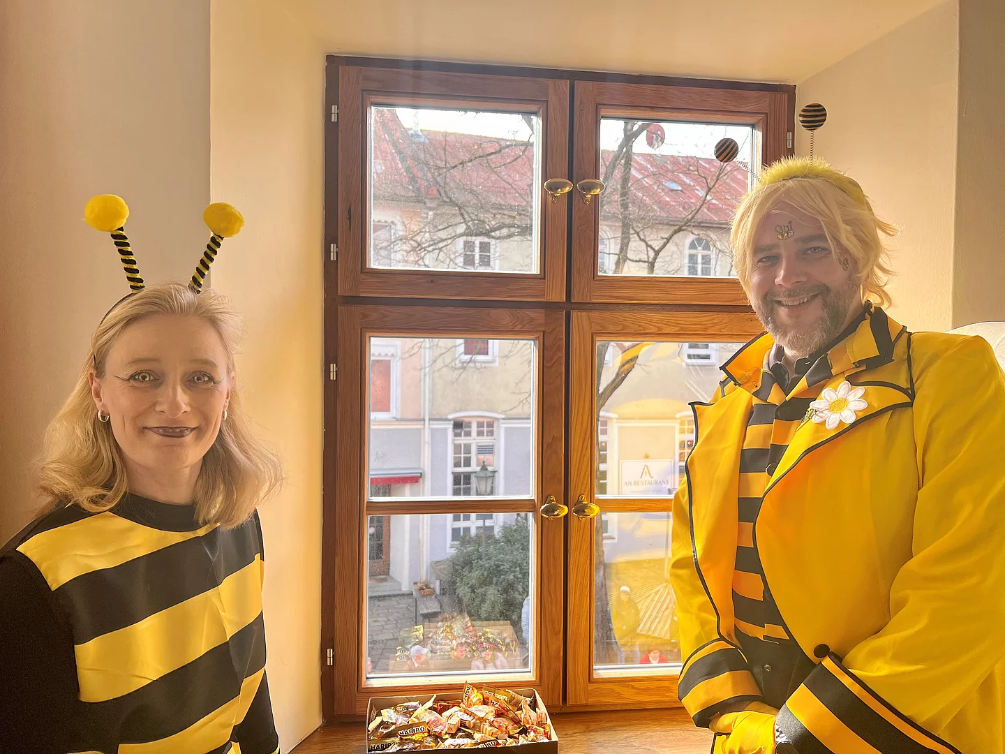 Bürgermeisterin Sandra Perzul, verkleidet als Biene Maja, und Schuldirektor Michael Kramer, alias Biene Willi, waren bestens ausgestattet, um dem Ansturm der rund 400 sehr hübsch und bunt verkleideten Schülerinnen und Schüler der Carl-Orff-Grundschule standhalten zu können. Eine bunte Bonbonmischung von insgesamt 50 Kilogramm ging nach und nach als süßer Regen auf die Kinder nieder, um sofort in den mitgebrachten Tüten verstaut zu werden. Na gut, so mancher süße Drops wanderte unter Umständen ohne Umwege oder Zwischenlager gleich in den Mund. Aber so genau gesehen hat es niemand – und mit ein bisschen Stärkung ließ sich der steile Berg über Herrenstraße und Hofmark hinauf zur Schule sicherlich viel leichter bewältigen.