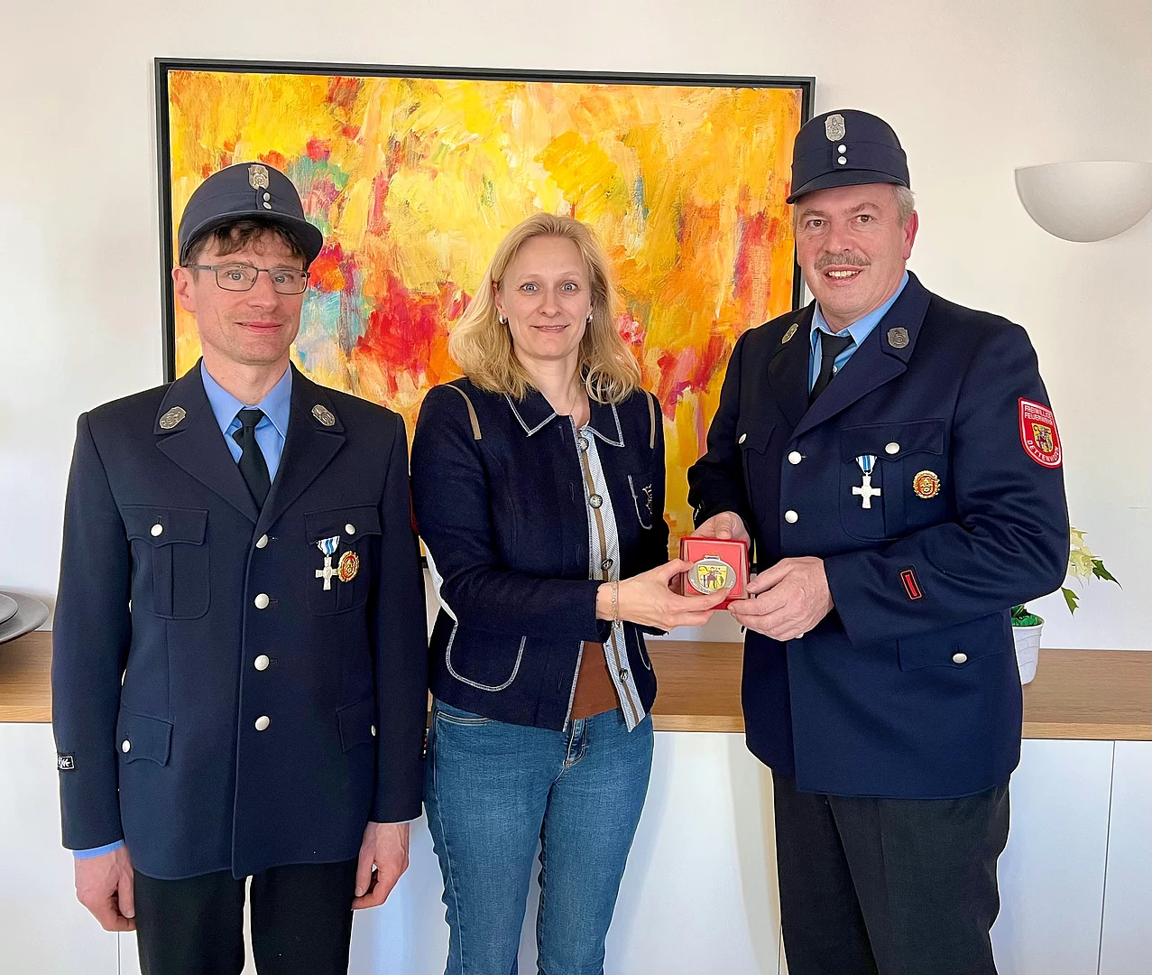 Bürgermeisterin Sandra Perzul lud ihn zur feierlichen Übergabe der Auszeichnung ein. Mit dabei war auch der 1. Kommandant der Freiwilligen Feuerwehr Dettenhofen Andreas Baur,