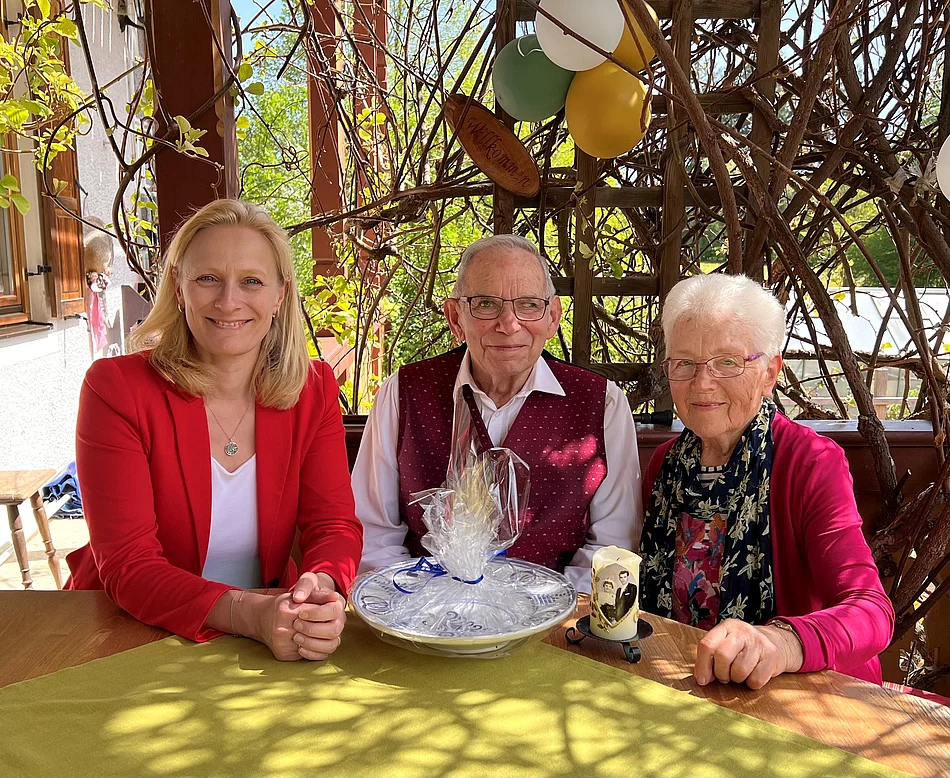Bürgermeisterin Sandra Perzul überreichte zur Diamantenen Hochzeit neben den persönlichen Glückwünschen eine traditionell getöpferte Schale und überbrachte die besten Wünsche auch von Landrat Thomas Eichinger. Sehr viel gelacht wurde beim Besuch der Bürgermeisterin, und so wünschte Sandra Perzul auch für die noch ausstehende Feier am Wochenende viel Freude und eine schöne Zeit im Kreise der Familie.