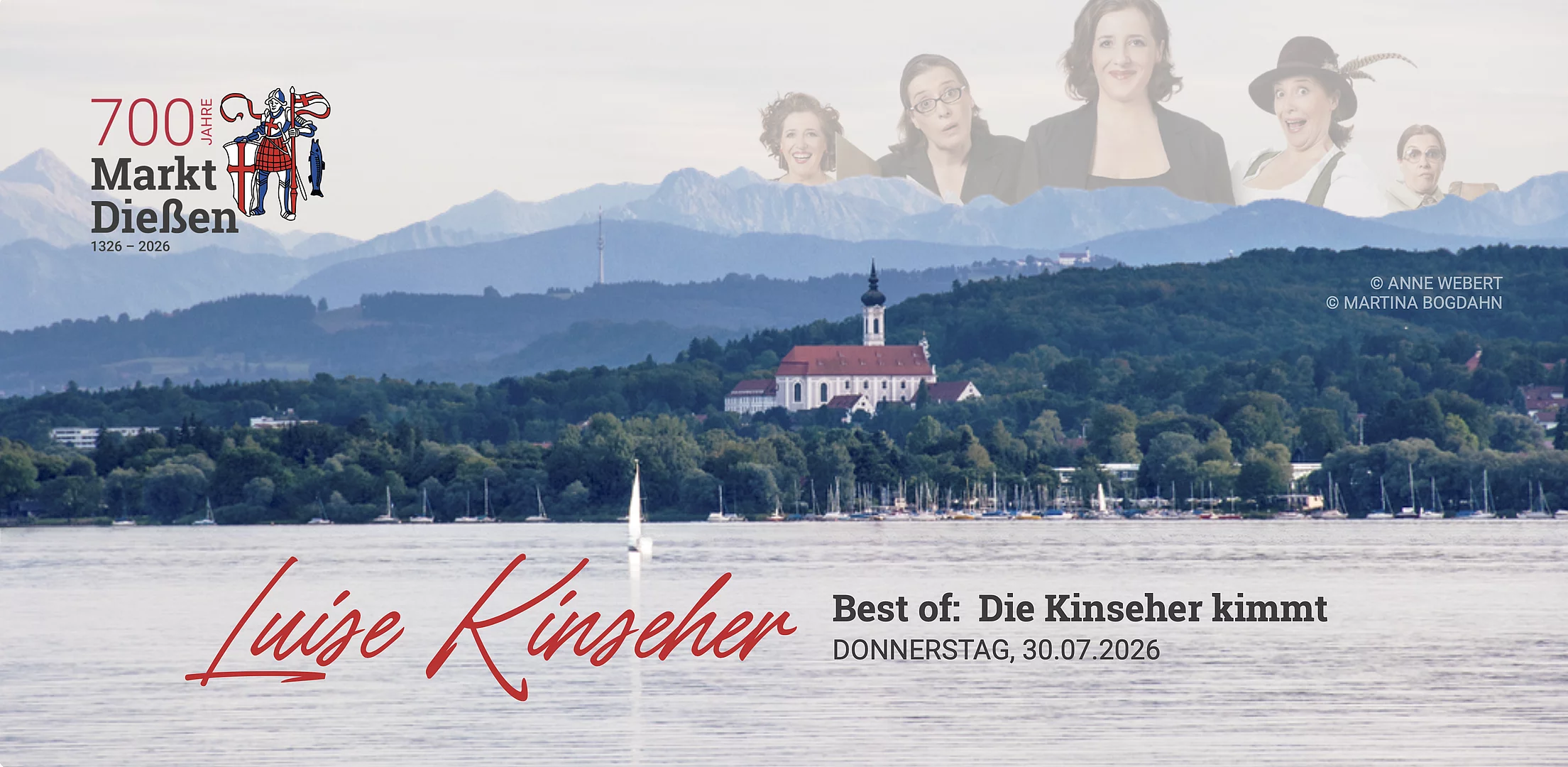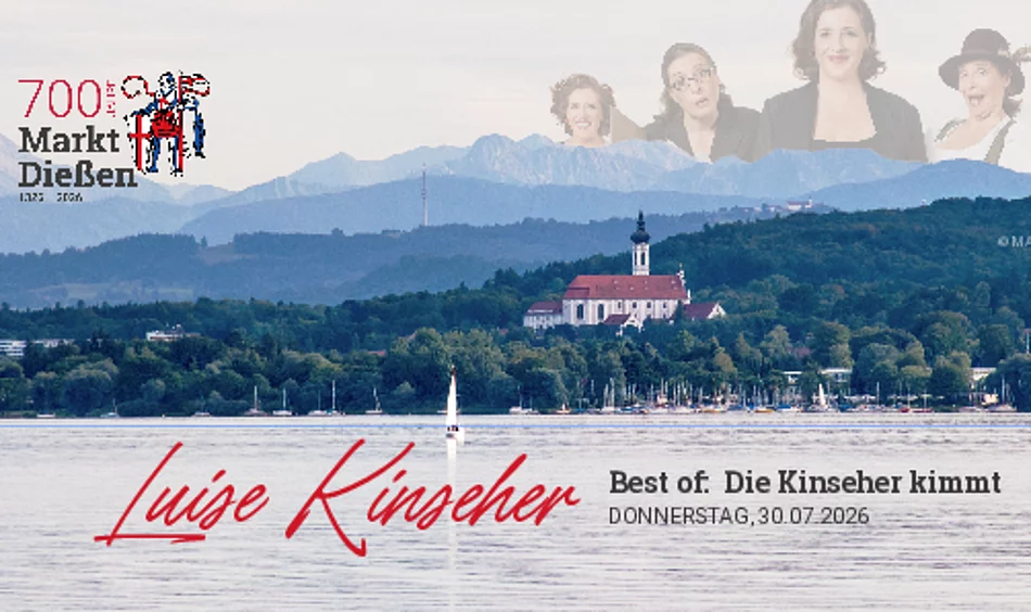 Die Festtage am See zu den Jubiläumsfeierlichkeiten beginnen mit einem ganz besonderen Programmpunkt: Am 30.07.2026 gastiert Luise Kinseher mit ihrem Best-of-Programm „Die Kinseher kimmt“ in Dießen am Ammersee.