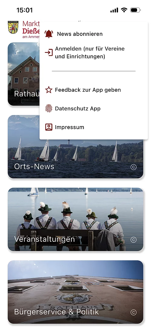 Haben Sie Anregungen oder ist Ihnen etwas aufgefallen? Im Bereich „Feedback zur App geben“ können Sie uns jederzeit Ihre Hinweise und Wünsche mitteilen. Wir freuen uns auf Ihr Feedback und darauf, Sie in der Dießen-App begrüßen zu dürfen!