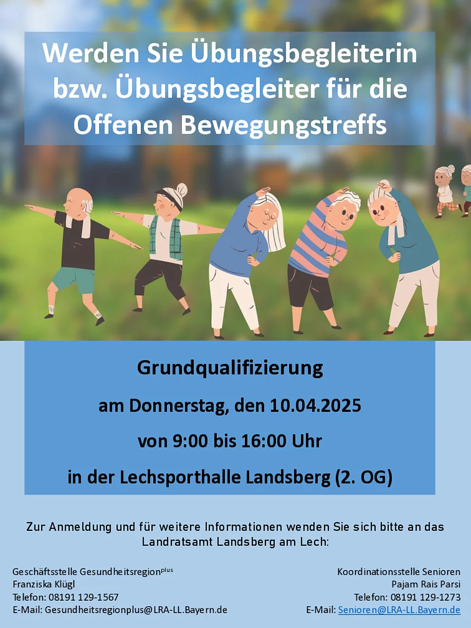 Am Donnerstag, den 10.04.2025 bietet das Landratsamt von 9 bis 16 Uhr eine weitere Grundqualifizierung für Übungsbegleiterinnen und Übungsbegleiter, die einen offenen Bewe-gungstreff aufbauen und leiten sowie bestehende unterstützen möchten.