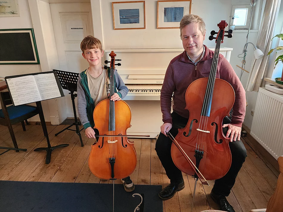 „Widele, wedele, hinterm Städele…“, so tönt am Montagnachmittag fröhlich die Melodie eines alten Volksliedes durch das Treppenhaus der Musikschule Dießen. Öffnet man die Tür zum Übungsraum im ersten Stock begegnet man dem neunjährigen Friedrich und seinem Cello-Lehrer Rüdiger Zippelius. Die Beiden haben sichtlich Spaß beim Musizieren.