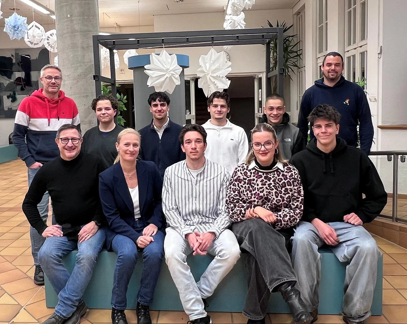 Vordere Reihe - v. l n. r.: Streetworker Alex Sauter mit Bürgermeisterin Sandra Perzul und Marc Lachera (25, Pflegefachkraft), Carlotta Korn (19, FOS-Schülerin) und Moritz Rogge (18, FOS-Schüler).