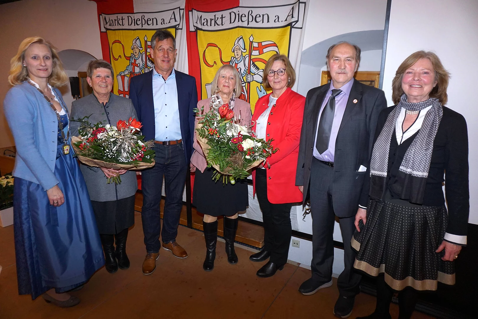 Nachbarschaftshilfe Dießen e. V. –Stellvertretend für den ganzen Verein wurden die Gründungsmitglieder Antoinette Bagusat und Sabine Krämer geehrt. Der Verein wurde im November 2013 gegründet. Er ist Anlaufstelle für Personen, die im Alltag Unterstützung brauchen, wie etwa bei Behördengängen und Arztbesuchen oder bei der Verrichtung von nicht alltäglichen häuslichen Aufgaben, z. B. ein Regal aufbauen und dergleichen mehr. Die Vereinigung hat über 80 Helferinnen und Helfer. Was sich nach einer großen Anzahl von Aktiven anhört, ist im Praktischen gerade ausreichend, da der Zulauf und die Anfragen bei der Nachbarschaftshilfe stetig zunehmen. So wurden im letzten Jahr 3000 Kilometer gefahren und zahllose Stunden ehrenamtliche Hilfe geleistet.