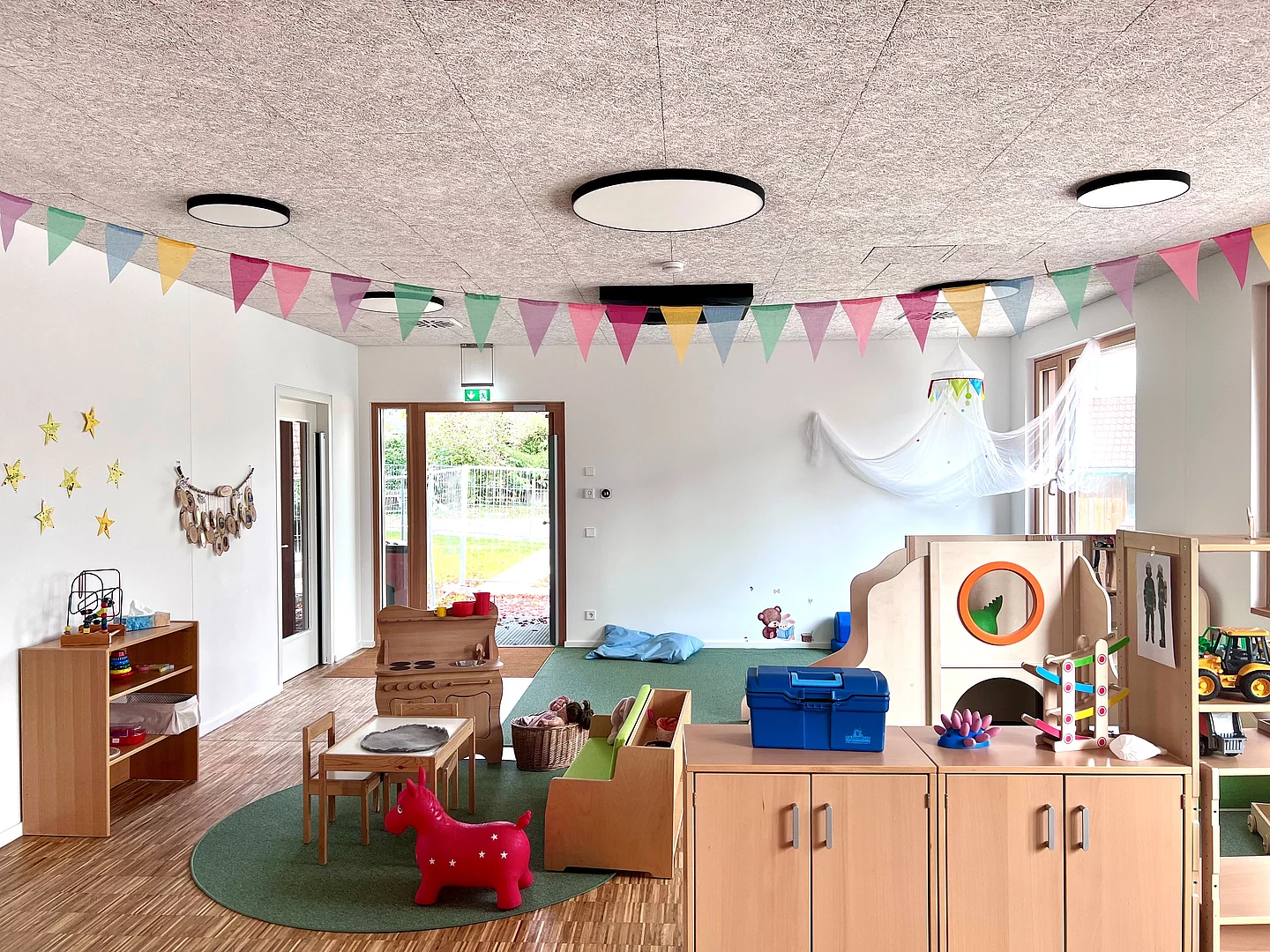 Von der viel gepriesenen Aufenthaltsqualität erzeugt durch die Holzbauweise, konnten sich alle interessierten Besucherinnen und Besucher auch bei einer Führung durch die Räumlichkeiten überzeugen. Auf über 180 m² bietet die Anlage hellen und freundlichen Raum für die fünfzehn Kinder der Sternchengruppe. Mit der Holzmodulanlage erhalten Kinder und Betreuerinnen nach der Interimslösung nun ein für ihre Bedürfnisse und Zwecke speziell konzipiertes Haus. Die Unterbringung der Krippenkinder in einem eigenen Gebäude hat dabei wichtige Vorteile. Ein eigener, ungestörter Tagesablauf und eine altersgerechte Struktur sind hierbei an erster Stelle zu nennen. Die Kinder im Alter von ein bis drei Jahren können sich im Gebäude weitestgehend frei bewegen, ohne Einschränkungen durch ältere Kinder. Genau wie das Haupthaus verfügt die Holzmodulanlage über verschiedene Räume, wie einen großen Gruppenraum, einen Turn- und Angebotebereich und einen Schlafraum. Damit wird das Konzept von Sozial-, Intensiv- und Ruhe- bzw. Rückzugsräumen auch hier fortgeführt.