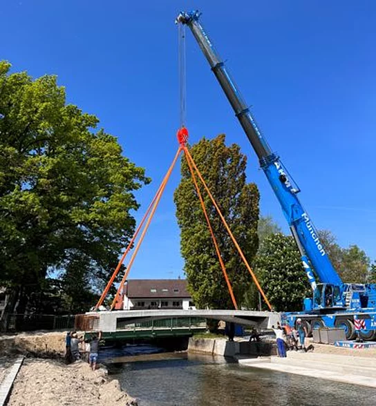 42 Tonnen schwer, 12,5 Meter lang und 4,30 Meter breit ist die neue Brücke in den Seeanlagen. Am Mittwoch wurde das schwere aber dennoch filigrane Betonbauwerk in seine Endposition gebracht. Hier ersetzt es die in die Jahre gekommene und marode "Rialto-Brücke", die bereits vor Monaten dort entfernt wurde. Die neue Brücke ist wesentlich breiter angelegt und führt barrierefrei mit vergleichsweise geringer Steigung über den Mühlbach.