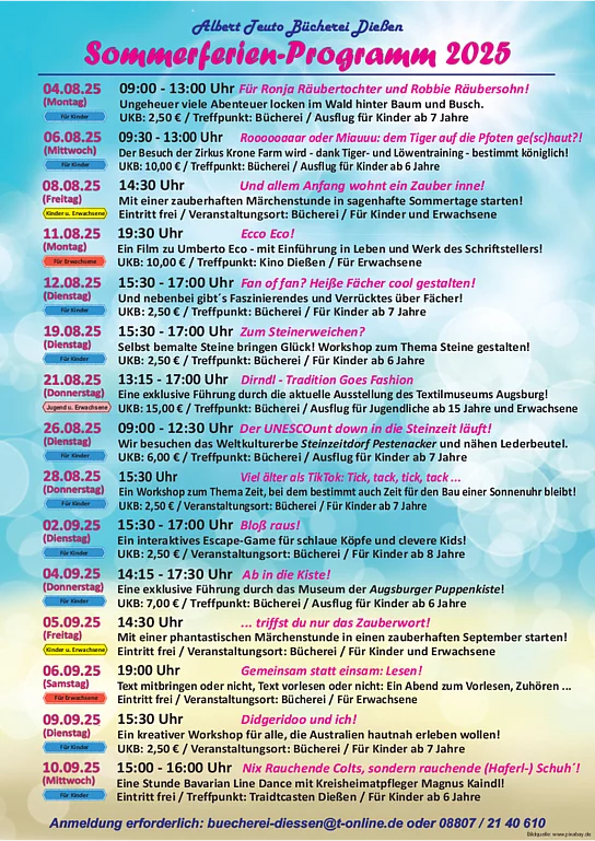 Zur „Reiseroute“: 4. August: Walderlebniszentrum Grafrath; 6. August: Zirkus Krone Farm; 8. August: Märchenstunde; 11. August: Kinobesuch mit Filmeinführung (für Erwachsene); 12. August: Gestaltung von kühlenden Fächern; 19. August: Glückssteine bemalen; 21. August: Führung Textilmuseum Augsburg (für Jugendliche und Erwachsene); 26. August: Steinzeitdorf Pestenacker; 28. August: Kreativworkshop Sonnenuhr; 2. September: Escape-Game; 4. September: Führung Museum der Augsburger Puppenkiste; 5. September: Märchenstunde; 6. September: gemeinsam lesen (für Erwachsene); 9. September: Kreativworkshop Australien; 10. September: Bavarian Line Dance