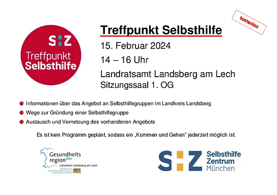 Der Treffpunkt Selbsthilfe findet am 15. Februar 2024 von 14 bis 16 Uhr im Landratsamt Landsberg, Sitzungssaal im 1.Stock statt (Von-Kühlmann- Str. 15).